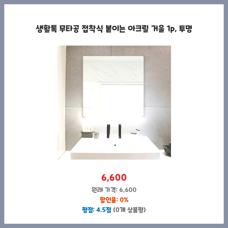 작은 공간에 거울이 필요했는데, 드릴 없이 간편하게 설치할 수 있어서 구매했습니다. 투명 아크릴이라 깔끔하고, 생각보다 접착력도 좋습니다. 가격도 저렴해서 부담 없었어요.