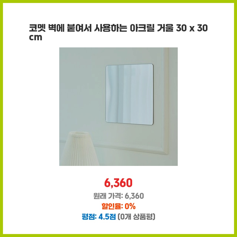 좁은 공간에 거울을 설치하고 싶었는데, 벽에 붙이는 타입이라 공간 활용도가 좋고, 30x30cm 사이즈가 적당해서 구매했습니다. 아크릴 소재라 가볍고 안전해서 좋았습니다.