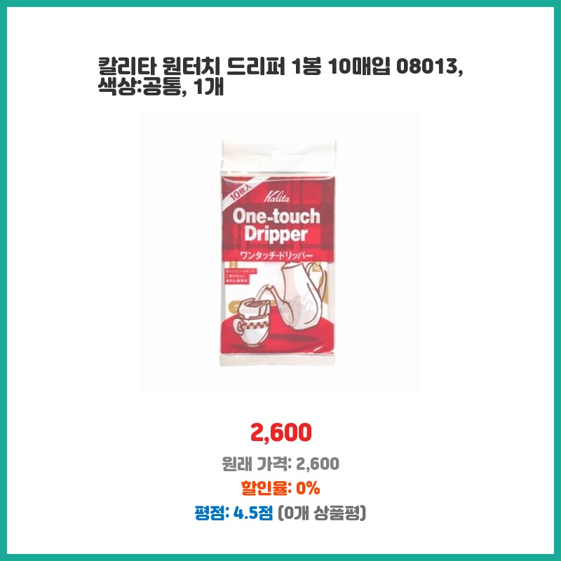 깔끔한 디자인과 편리한 원터치 방식이 마음에 들어 구매했습니다. 1회용이라 위생적이고, 휴대하기에도 간편해서 자주 사용하게 될 것 같습니다. 칼리타 제품이라 믿고 쓸 수 있다는 점도 좋았습니다.