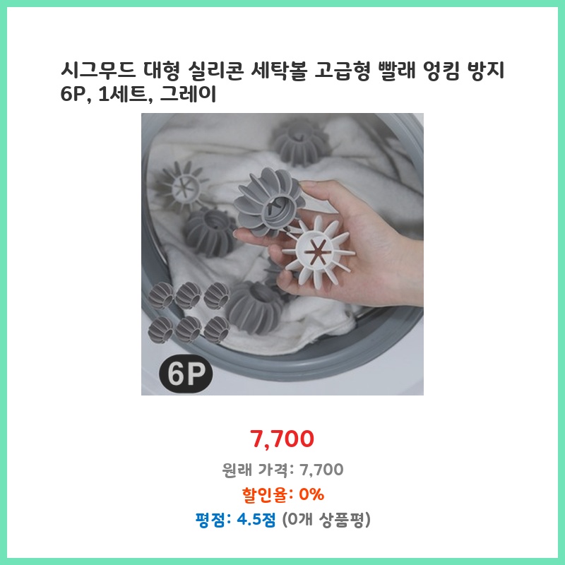 빨래 엉킴 때문에 스트레스였는데, 실리콘 세탁볼 사용 후 옷감 손상이 줄고 빨래 건조 시간도 단축되어 만족합니다. 6개입이라 여러 번 사용 가능하고, 고급형이라 내구성도 좋아 보입니다. 그레이 색상도 세련됩니다.