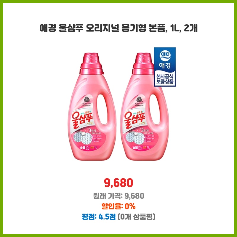 대용량이라 가성비가 좋고, 울샴푸라 옷감 손상 걱정 없이 섬세하게 세탁할 수 있어서 구매했습니다. 2개 세트라 더욱 경제적입니다. 오리지널 제품이라 믿고 쓸 수 있다는 점도 좋았습니다.