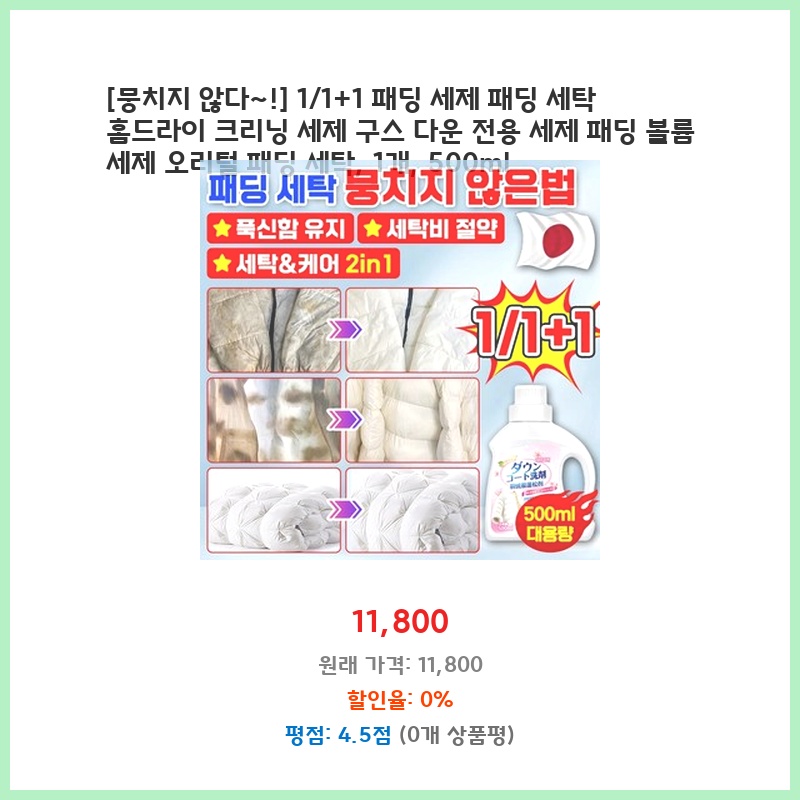 최신 트렌드 1/1+1 패딩 세제 패딩 세탁 홈드라이 크리닝 세제 구스 다운 전용 세제 패딩 볼륨 세제 오리털 패딩 세탁 1개 500ml 지금만 할인 중