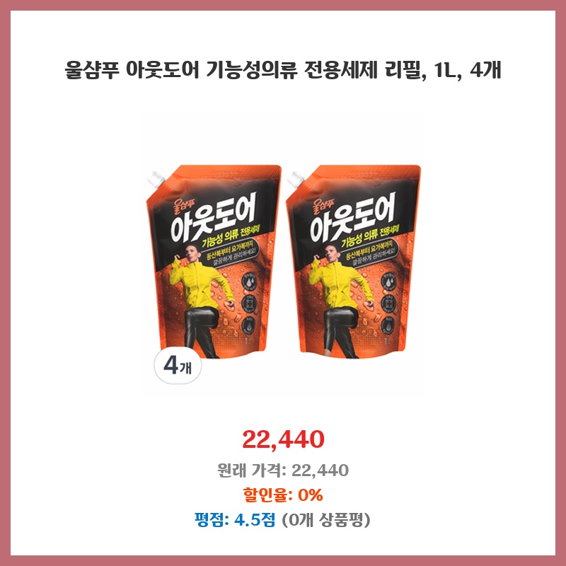 아웃도어 의류를 자주 세탁하는데, 기능성을 유지하면서 섬유 손상 없이 세탁할 수 있는 전용 세제가 필요했습니다. 1L 용량에 4개 리필이라 경제적이고, 울샴푸라는 브랜드에 대한 신뢰도 있었습니다. 넉넉한 용량으로 오래 사용할 수 있어 좋습니다.