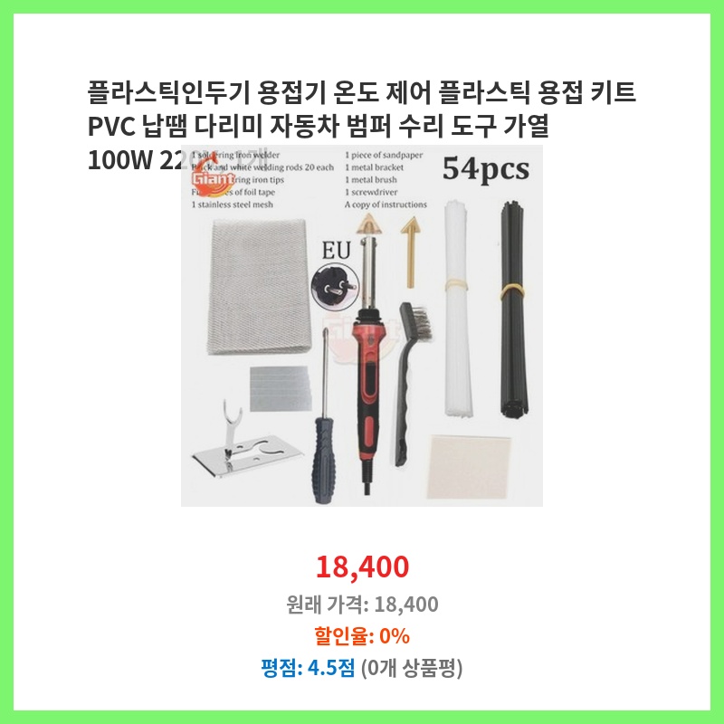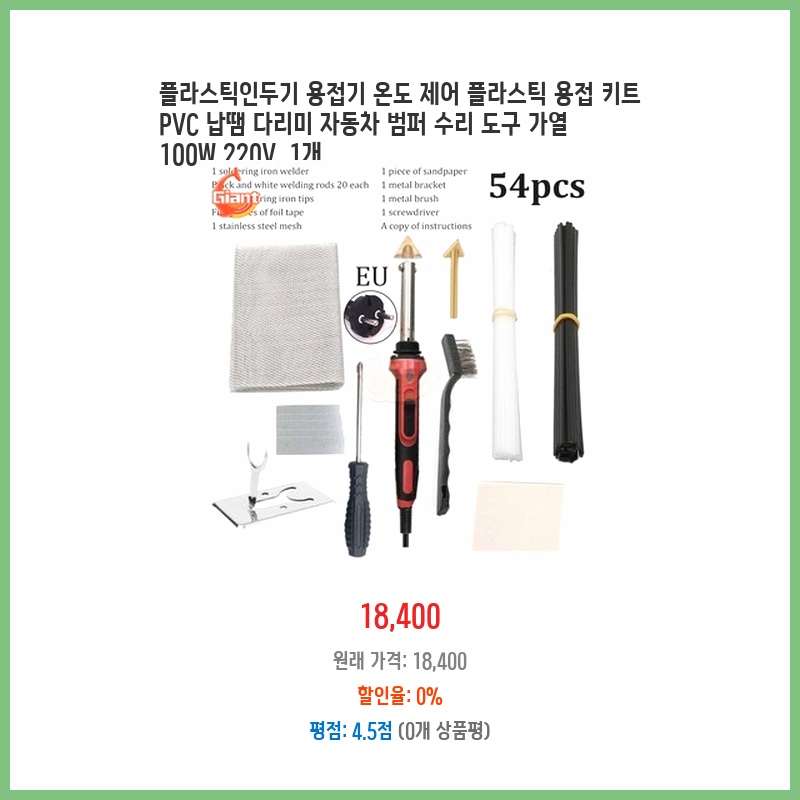 자동차 범퍼 수리 때문에 구매했습니다. 100W의 출력과 온도 조절 기능이 있어 작업이 수월할 것 같았고, 플라스틱 용접에 특화된 키트라 효율적인 수리가 가능할 것으로 예상했습니다. 가격 대비 성능이 괜찮아 보였습니다.