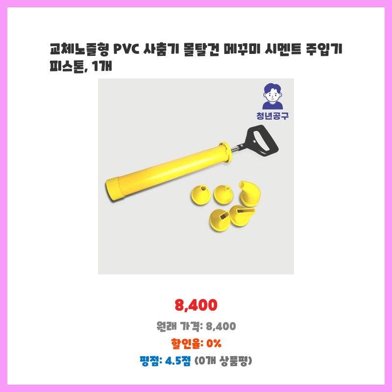 낡은 몰탈 건의 노즐이 마모되어 교체가 필요했습니다. PVC 재질이라 내구성이 좋아 보이고, 가격도 저렴해서 부담없이 구매했습니다. 피스톤 방식이라 사용이 편리할 것 같아 기대됩니다.