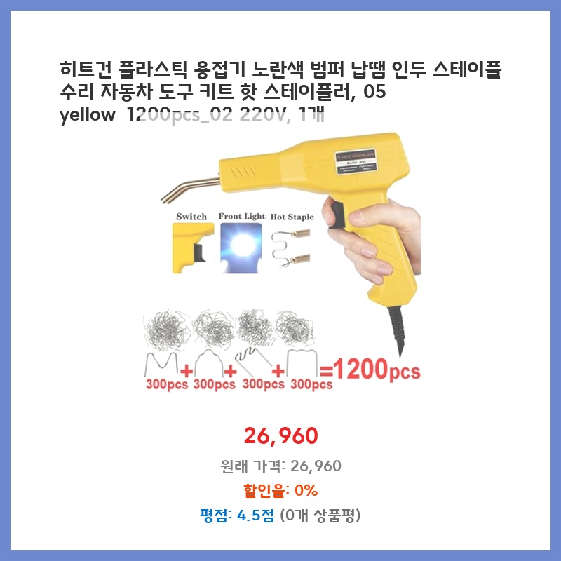 자동차 범퍼 수리에 필요한 용접기가 있어야 했는데, 이 제품은 스테이플과 납땜 기능이 함께 있어 편리해 보였습니다. 다양한 플라스틱 용접에 활용 가능하고, 합리적인 가격에 1200개의 스테이플까지 포함되어 있어 경제적이라고 판단했습니다.