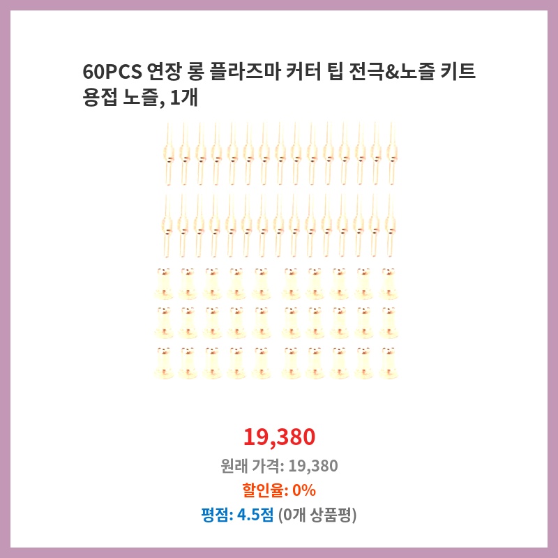 플라즈마 커터 팁과 전극, 노즐을 한꺼번에 60개나 구매할 수 있어 경제적입니다. 잦은 교체가 필요한 소모품이라 여러 개 준비하면 작업 효율이 높아질 것 같아 구매했습니다. 다양한 사이즈가 포함되어 있어 편리할 것으로 예상됩니다.
