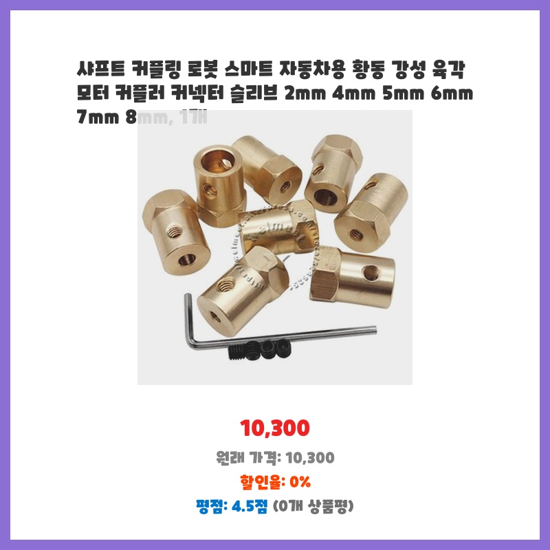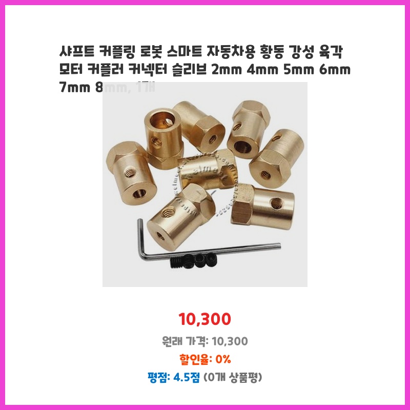 로봇 자동차 제작에 필요한 샤프트 커플링을 찾던 중, 황동 소재의 내구성과 다양한 사이즈(2mm8mm) 지원에 끌려 구매했습니다. 정밀한 기계 가공으로 견고하고, 정확한 연결이 가능할 것으로 예상되어 선택했습니다.
