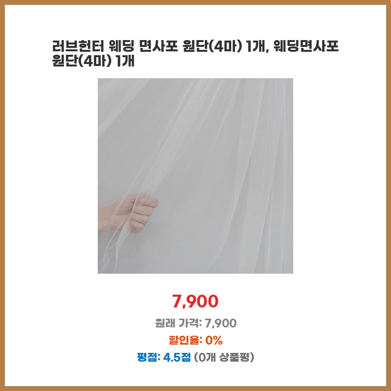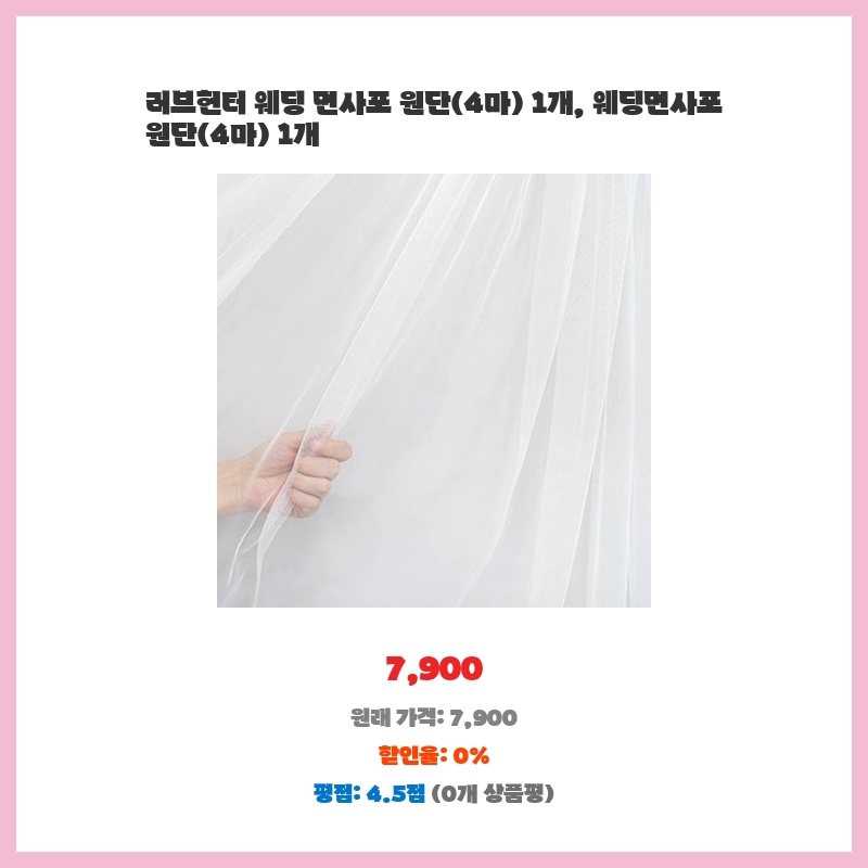 웨딩 면사포를 직접 만들고 싶어서 원단을 찾던 중 가격 대비 양이 많고 품질도 괜찮아 보여 구매했습니다. 4마면 충분한 양이라 여러 디자인을 시도해볼 수 있을 것 같아 만족스럽습니다.
