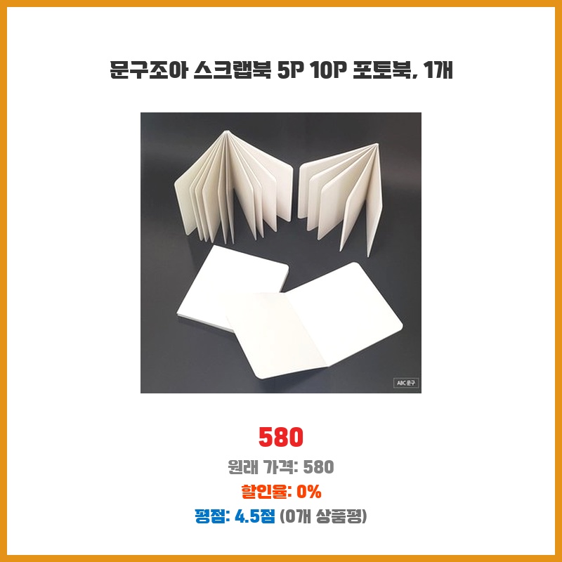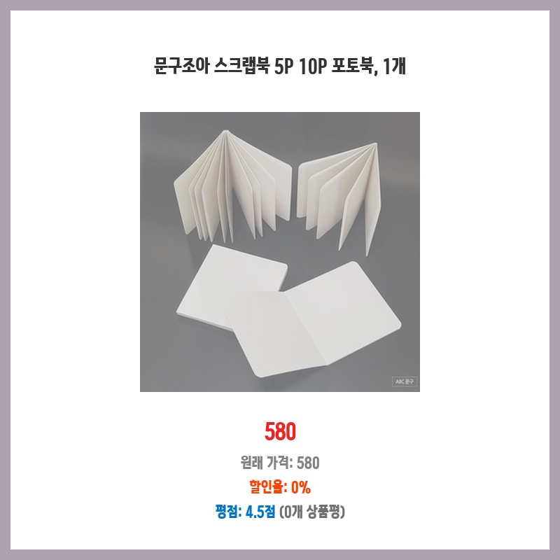 580원이라는 저렴한 가격에 5장 또는 10장의 스크랩북을 얻을 수 있어 가성비가 좋다고 생각했습니다. 사진이나 메모를 간편하게 정리하고 보관하기에 적합해 보였습니다. 휴대성도 좋아서 필요할 때마다 꺼내 쓰기 편리할 것 같았습니다.