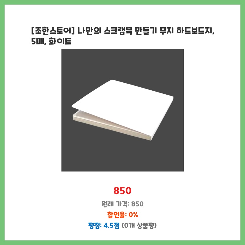 깔끔한 화이트 하드보드지라 스크랩북 만들기에 적합할 것 같아 구매했습니다. 5매라 양도 적당하고, 무지라 자유롭게 디자인할 수 있다는 점이 좋았습니다. 두께도 적당히 두꺼워서 튼튼해 보였습니다.