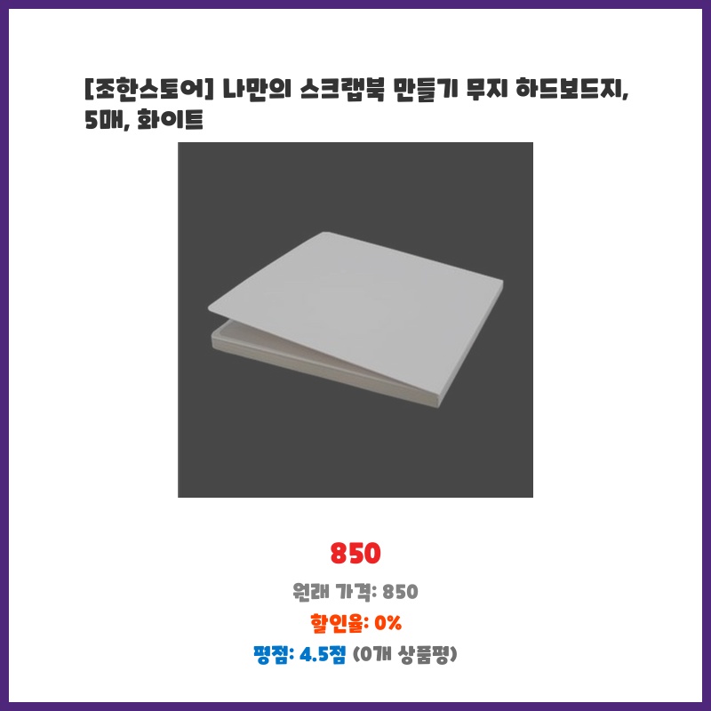 생각보다 두꺼워서 좋았어요! 스크랩북 만들기에 딱 맞는 두께와 크기입니다. 깔끔한 화이트 색상도 마음에 듭니다.