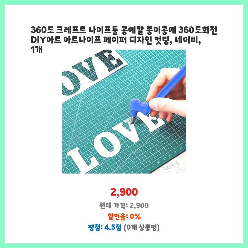 종이공예를 자주 하는데, 기존 칼보다 360도 회전 기능이 작업 효율을 높일 것 같아 구매했습니다. 손목에 무리가 덜 가는 디자인도 마음에 들었습니다. 가격도 부담스럽지 않아 좋았습니다.