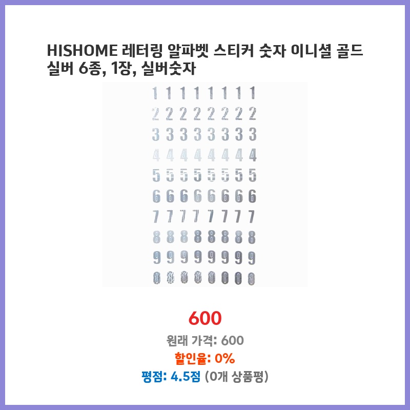 HISHOME 레터링 알파벳 스티커 숫자 이니셜 골드 실버 6종, 1장, 실버숫자
