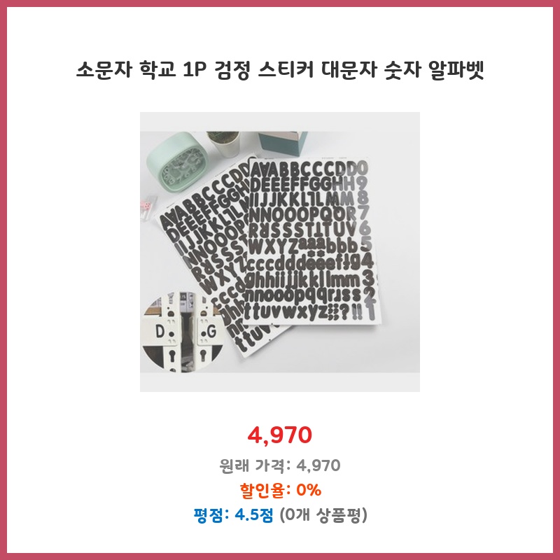 아이 학습용 스티커가 필요했는데, 소문자와 대문자, 숫자, 알파벳이 한 세트로 구성되어 있어 활용도가 높을 것 같아 구매했습니다. 검정색이라 어떤 배경에도 잘 보이고, 1P라 가격도 부담 없어서 좋았습니다. 크기도 적당해서 다양한 곳에 활용 가능할 것 같습니다.