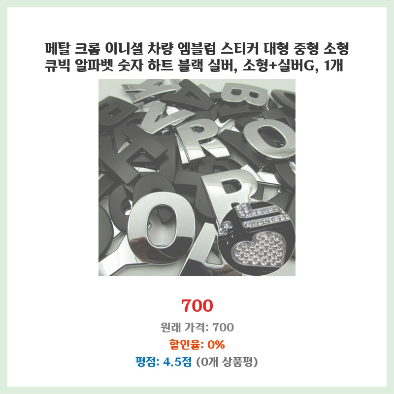 메탈 크롬 이니셜 차량 엠블럼 스티커 대형 중형 소형 큐빅 알파벳 숫자 하트 블랙 실버, 소형+실버G, 1개