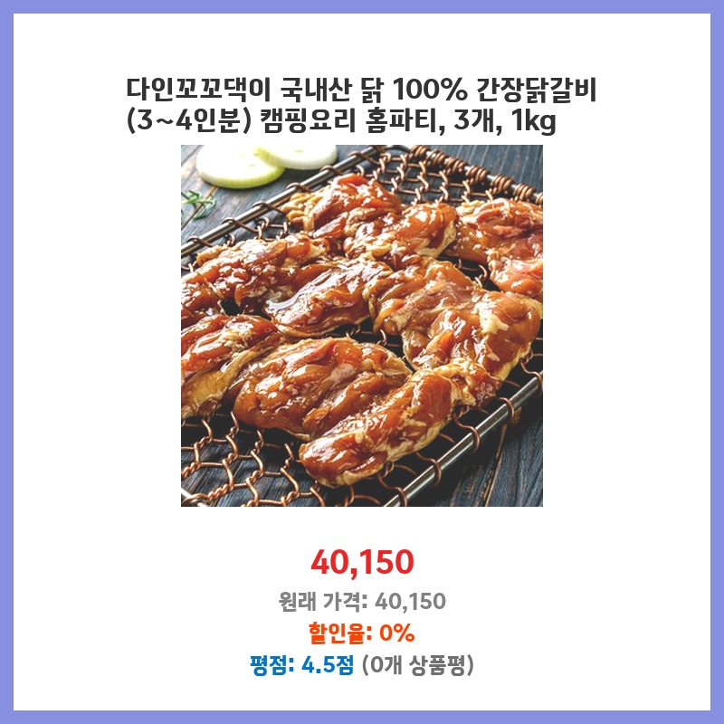 국내산 닭 100에 34인분이라 가족과 캠핑이나 홈파티에 적합해 보였습니다. 간장 양념이라 아이들도 잘 먹을 것 같고, 1kg에 3팩이라 넉넉하게 먹을 수 있을 것 같아 구매했습니다. 조리도 간편하다고 해서 선택했습니다.