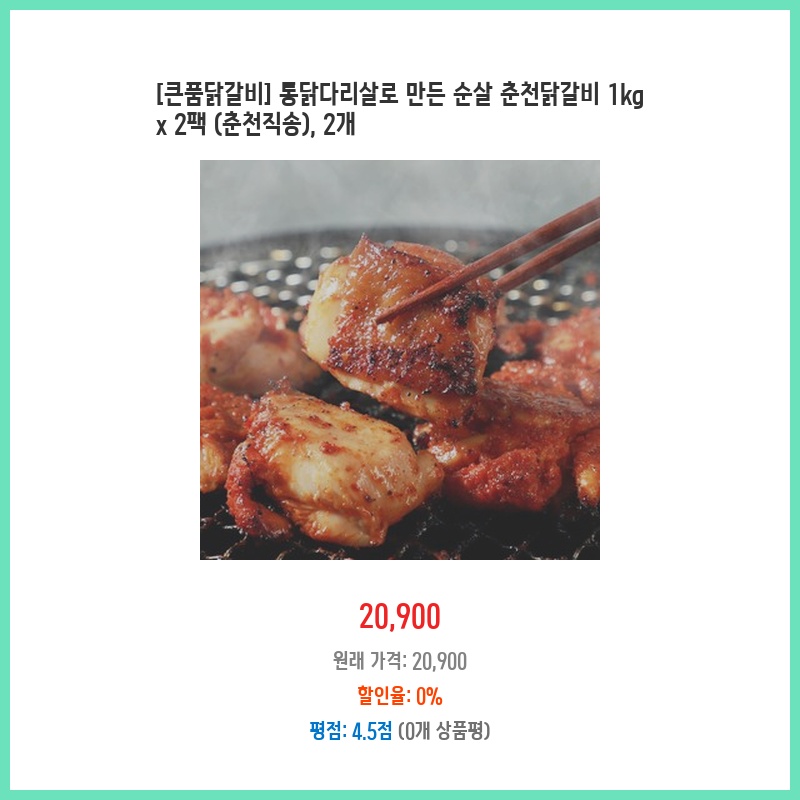 춘천에서 직송되는 닭갈비라 신선하고, 통닭다리살만 사용해서 퍽퍽하지 않고 부드러울 것 같아 구매했습니다. 1kg씩 두 팩이라 양도 넉넉하고, 순살이라 조리가 편리할 것 같았습니다.