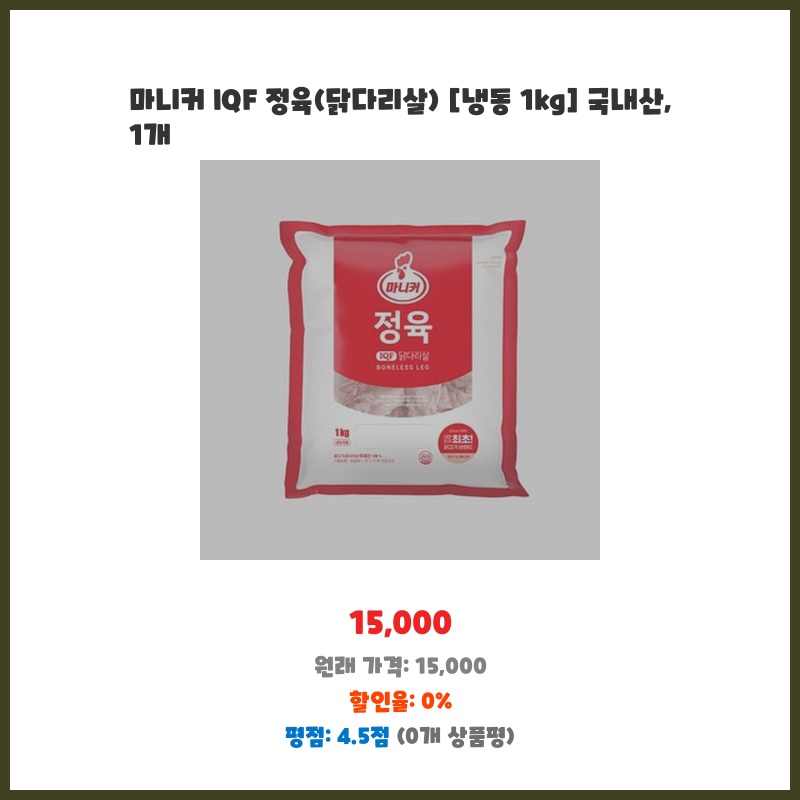 국내산 닭다리살이라 안심하고 먹일 수 있어 아이들 간식으로 자주 이용합니다. IQF 개별 급속 동결이라 해동 후에도 닭고기의 육즙이 살아있어 맛있고, 1kg 대용량이라 부담없이 사용할 수 있어 좋습니다. 편리하게 사용할 수 있는 점이 가장 큰 장점입니다.