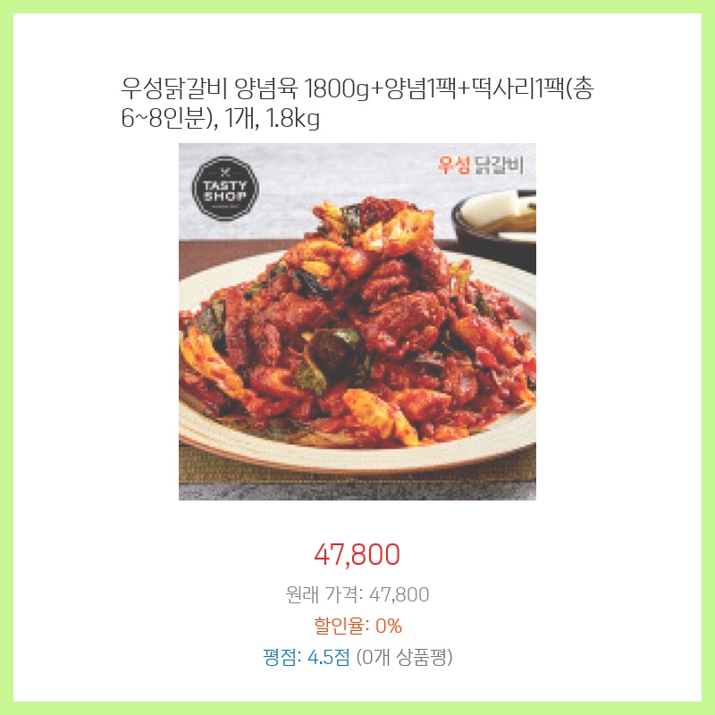 68인분이라 가족 외식이나 손님 접대에 적합하고, 양념과 떡사리가 포함되어 따로 준비할 것이 없어 편리해 보여 구매했습니다. 1.8kg의 넉넉한 양도 마음에 들었습니다. 우성닭갈비의 맛은 이미 알고 있었기에 믿고 구매했습니다.