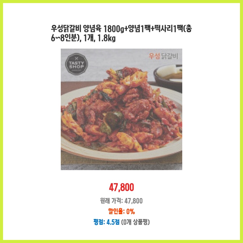우성닭갈비 양념육 1800g+양념1팩+떡사리1팩(총 6~8인분), 1개, 1.8kg