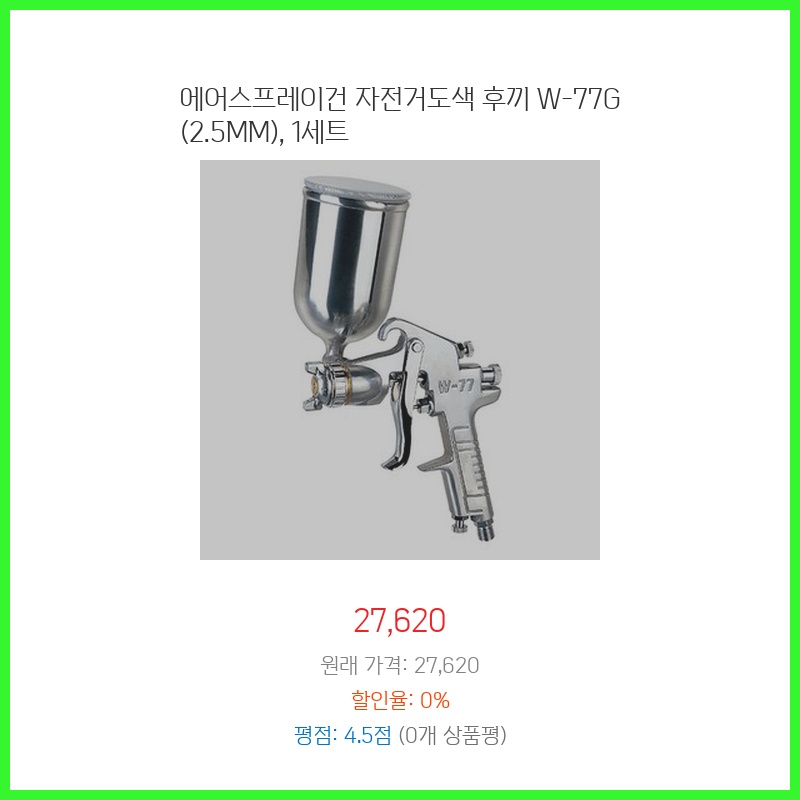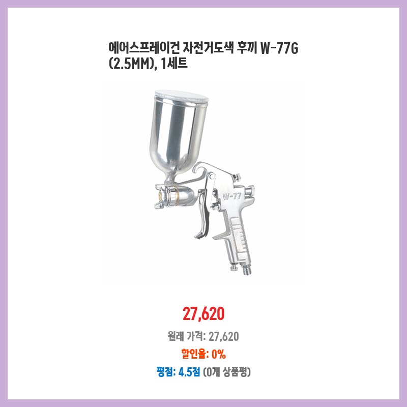 자전거 프레임 도색을 직접 해보고 싶어서 구매했습니다. 후끼 W-77G는 가격 대비 성능이 괜찮다는 평이 많아 선택했고, 2.5mm 노즐은 자전거 도색에 적합하다고 판단했습니다. 세트 구성도 편리해 보였습니다.