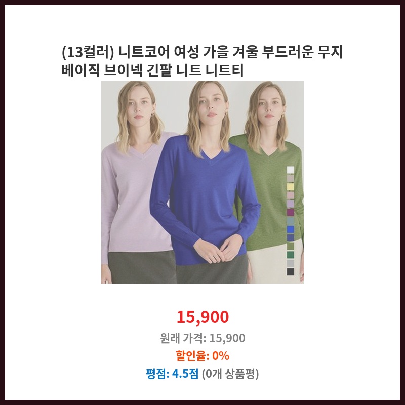 가을, 겨울 이너로 활용하기 좋은 얇은 니트를 찾던 중 레이어드 하기에 적합한 브이넥 디자인과 2만원대의 합리적인 가격에 구매했습니다. 부드러운 소재와 깔끔한 디자인이 마음에 들었습니다.