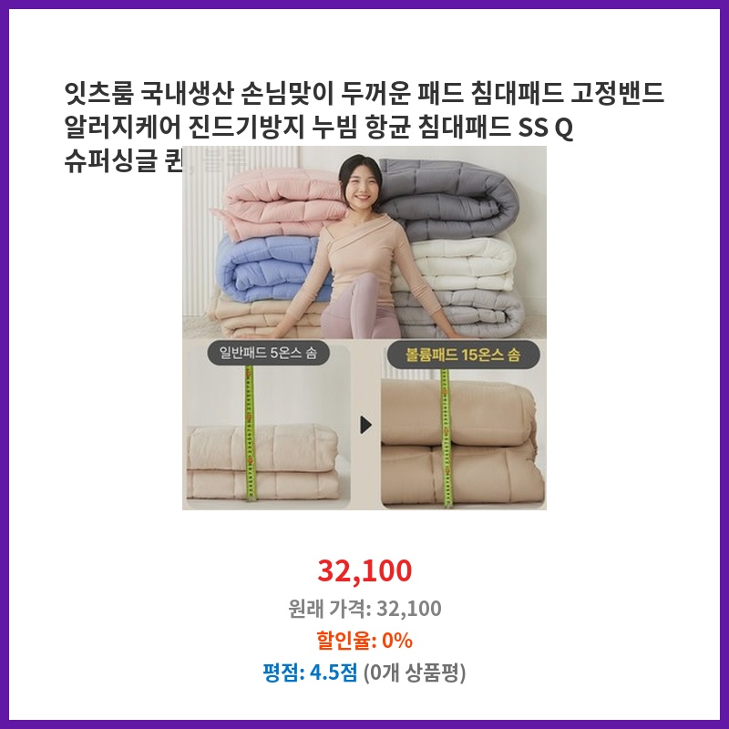 알레르기 때문에 침구 관리가 힘들었는데, 진드기 방지와 항균 기능이 있는 침대패드라 구매했습니다. 누빔 처리로 폭신하고, 고정밴드가 있어서 밀리지 않아 편리할 것 같아 선택했습니다. SS사이즈와 퀸사이즈 모두 있어서 사이즈 선택의 폭도 넓었습니다.