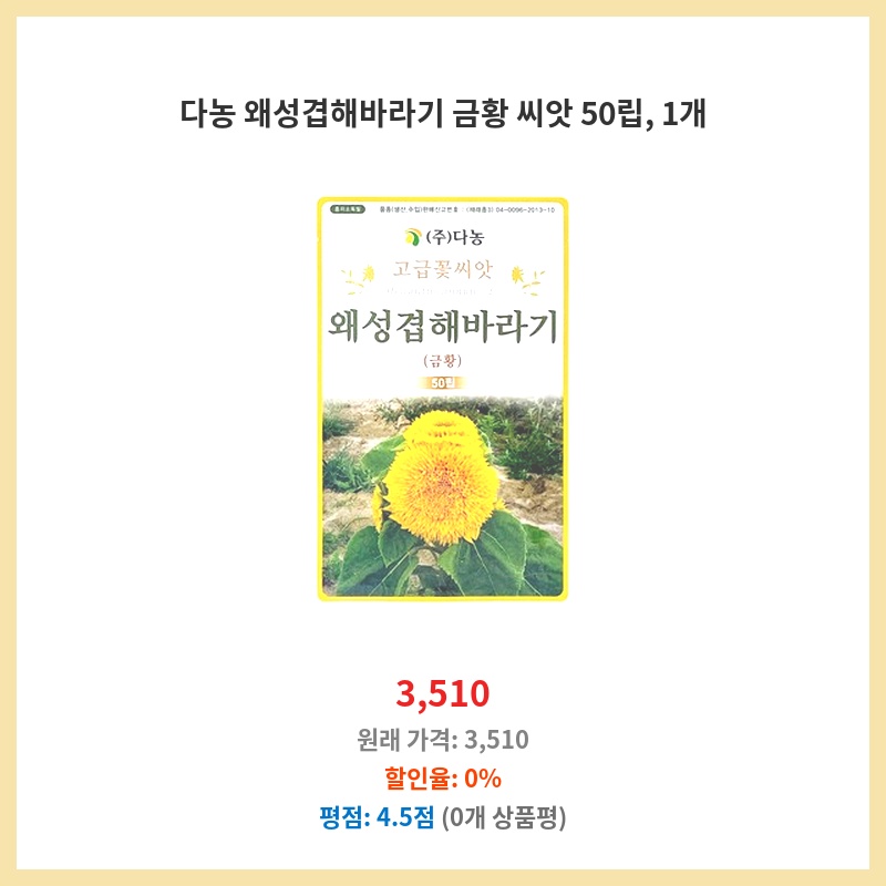 아이들과 함께 해바라기를 키워보고 싶어서 구매했습니다. 왜성 품종이라 공간 제약 없이 키울 수 있고, 금황 품종이라 꽃이 예쁠 것 같아 기대됩니다. 50립이면 충분히 여러 개 심어볼 수 있을 것 같습니다.