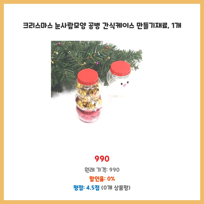 아이와 함께 크리스마스 분위기를 내며 간식을 보관할 귀여운 용기가 필요했습니다. 눈사람 모양이라 아이도 좋아하고, 직접 만들어 사용하는 재미도 있어 구매했습니다. 재료도 다 포함되어 편리했습니다.