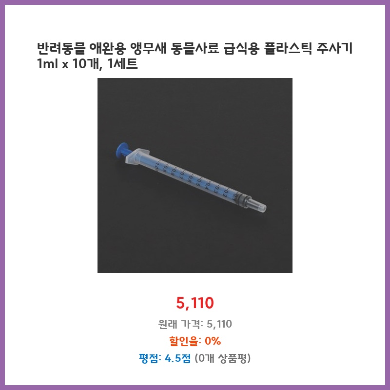 아픈 앵무새에게 약을 먹이는 게 힘들어서 주사기를 찾았습니다. 1ml 용량이라 소량씩 정확하게 먹일 수 있고, 10개나 들어있어서 오래 쓸 수 있어 경제적입니다. 플라스틱 재질이라 세척도 편리합니다.
