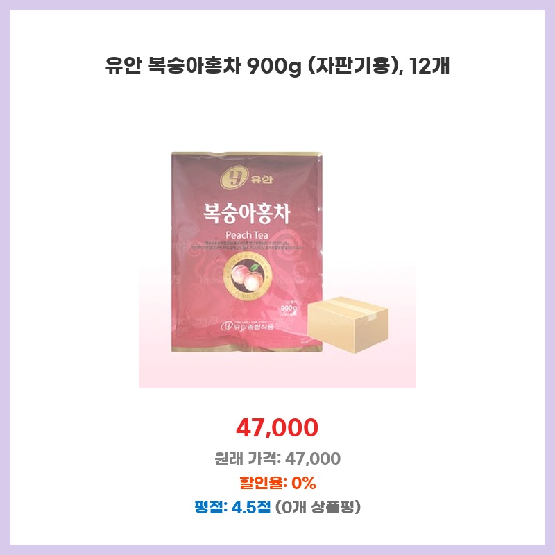 자판기 운영 중인데, 유안 복숭아홍차 인기가 많아 900g 대용량으로 구매했습니다. 12개들이라 재고 관리도 편하고, 가격 대비 양이 많아 경제적입니다. 복숭아 향이 은은하게 나서 고객 만족도도 높습니다.