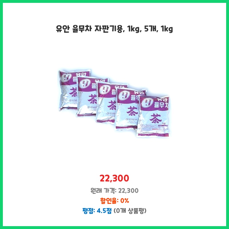 사무실에서 율무차를 간편하게 즐기고 싶어 자판기용 율무차를 찾던 중, 유안 율무차의 품질과 가격이 마음에 들어 구매했습니다. 1kg 봉지 5개라 오래 사용할 수 있는 점도 좋았습니다. 자판기에 깔끔하게 들어가는 용량도 장점입니다.