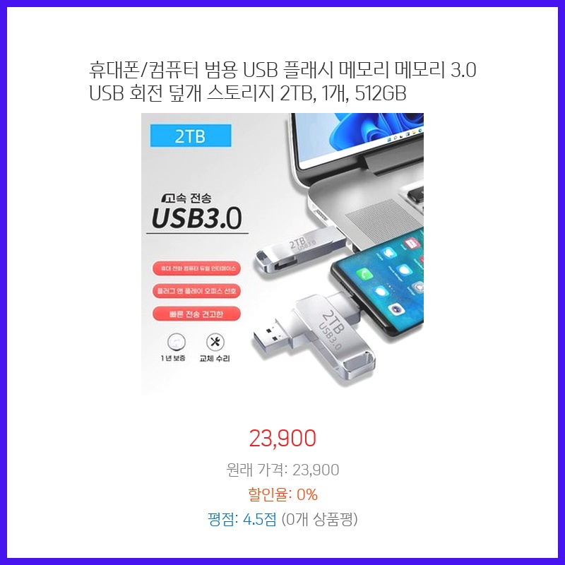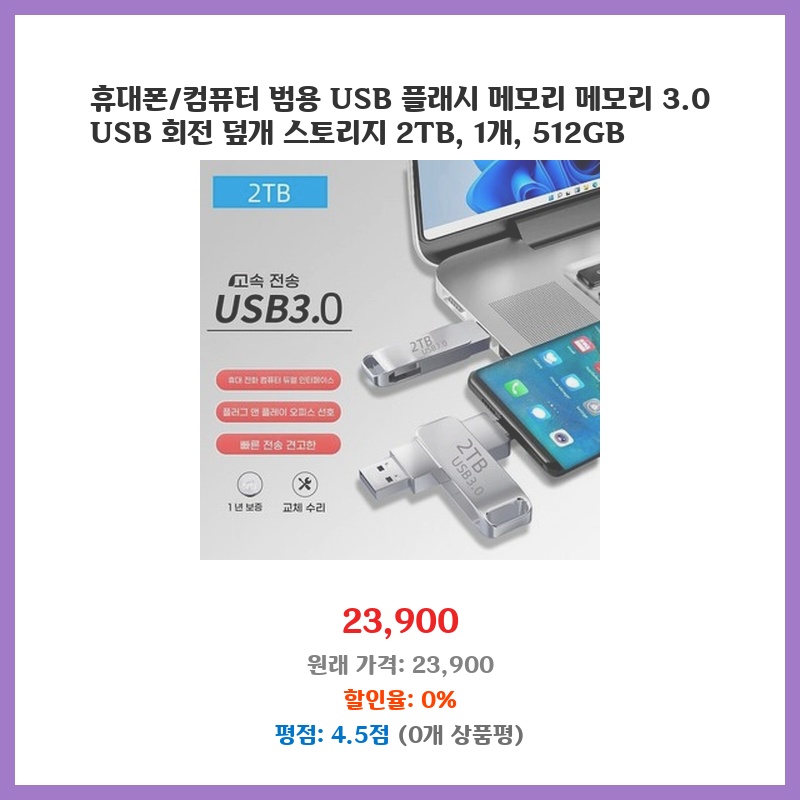 데이터 전송 속도가 빨라서 매우 만족합니다. 휴대하기도 편하고, 회전 덮개 덕분에 안전하게 사용할 수 있어 좋네요. 용량도 충분합니다!