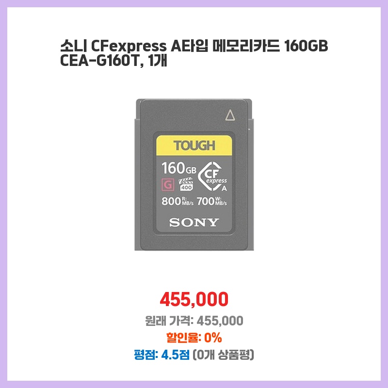 4K 영상 촬영을 위한 빠른 읽기쓰기 속도가 필요했습니다. 소니 CFexpress A 타입 카드는 고용량에 안정적인 성능을 제공하여 프로젝트 작업에 적합하다고 판단했습니다. 160GB 용량으로 넉넉하게 사용 가능한 점도 매력적이었습니다.