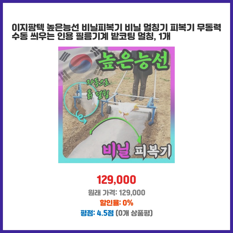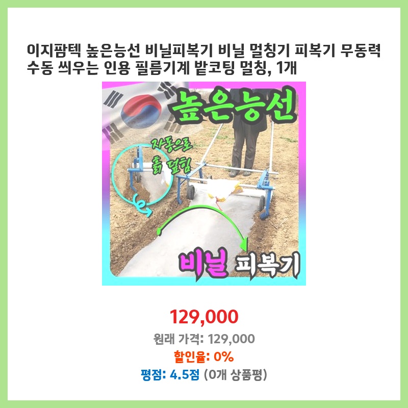무동력이라 편리하고, 가격 대비 성능이 좋아 보여 구매했습니다. 비닐 멀칭 작업이 수월해질 것으로 기대하며, 농작물 관리에 효율성을 높일 수 있을 것 같습니다. 휴대성도 좋아 보입니다.