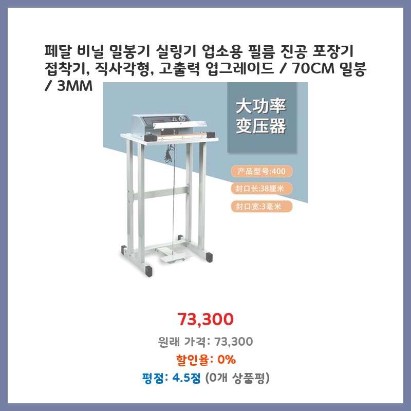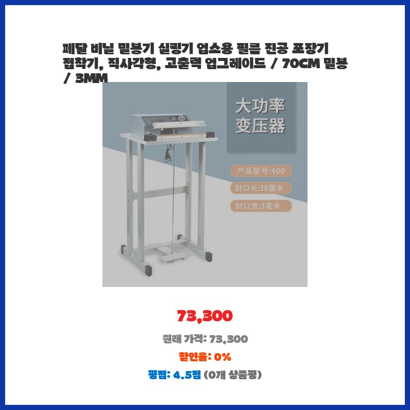 업소용으로 넉넉한 70cm 밀봉 길이와 3mm 넓이의 밀봉이 필요했습니다. 고출력이라 밀봉 속도도 빠르고, 튼튼한 직사각형 디자인이라 오래 사용할 수 있을 것 같아 구매했습니다. 가격 대비 성능이 만족스러워 보였습니다.