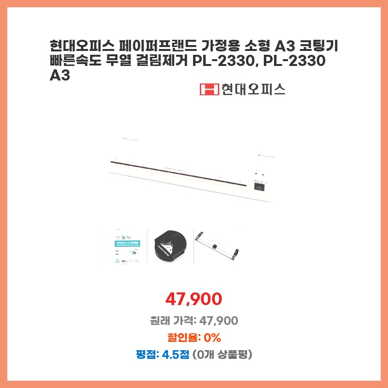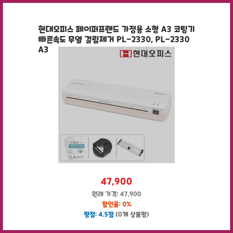 현대오피스 페이퍼프랜드 가정용 소형 A3 코팅기 빠른속도 무열 걸림제거 PL-2330, PL-2330 A3
