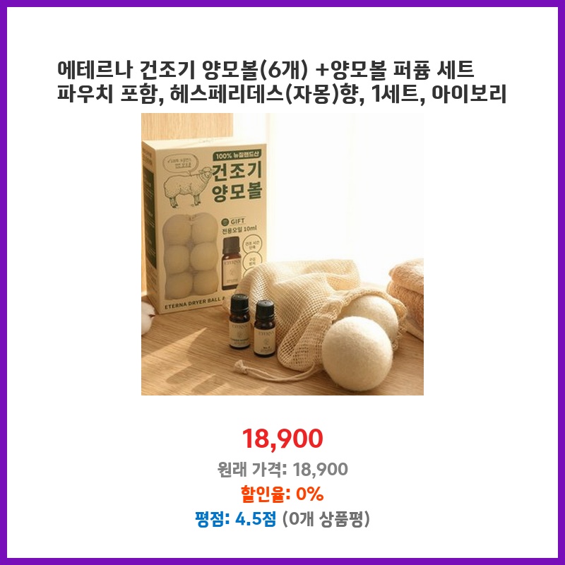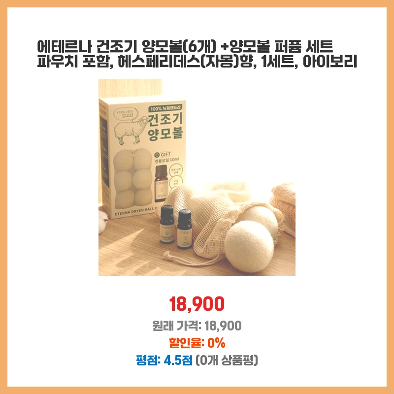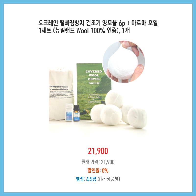 건조기 사용 후 옷에 붙는 섬유 먼지가 신경 쓰였습니다. 뉴질랜드산 양모 100 인증에 털빠짐 방지 효과가 있다는 설명에 구매했습니다. 아로마 오일까지 포함되어 있어 향긋한 빨래를 기대하며 선택했습니다.