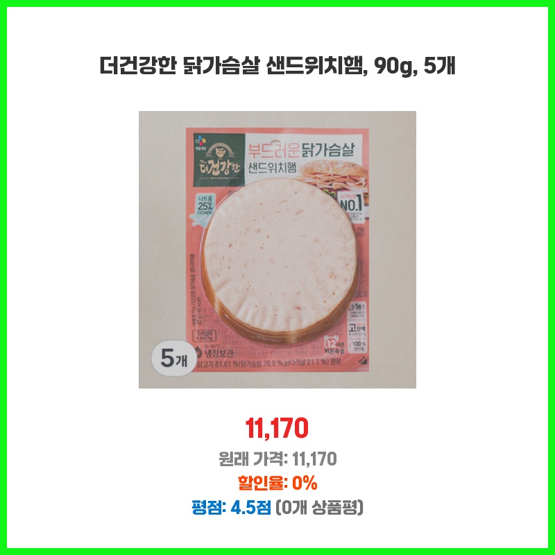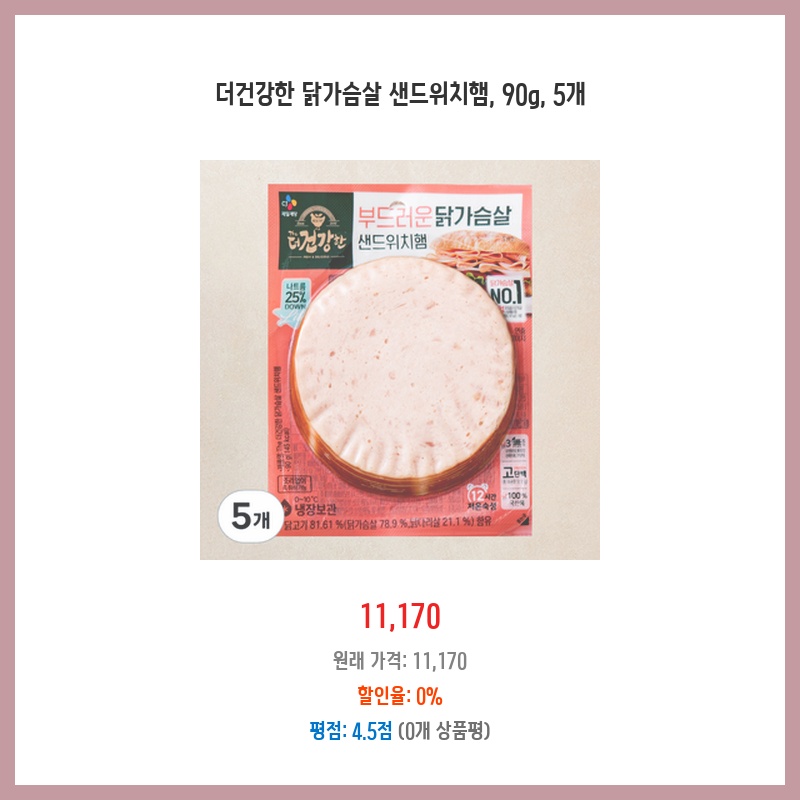 다이어트 중 닭가슴살 섭취가 필요했고, 샌드위치햄 형태라 간편하게 섭취할 수 있어 구매했습니다. 5개입이라 넉넉하고, 90g씩 개별 포장되어 위생적입니다. 나트륨 함량도 다른 제품들에 비해 낮은 편이라고 생각되어 선택했습니다.