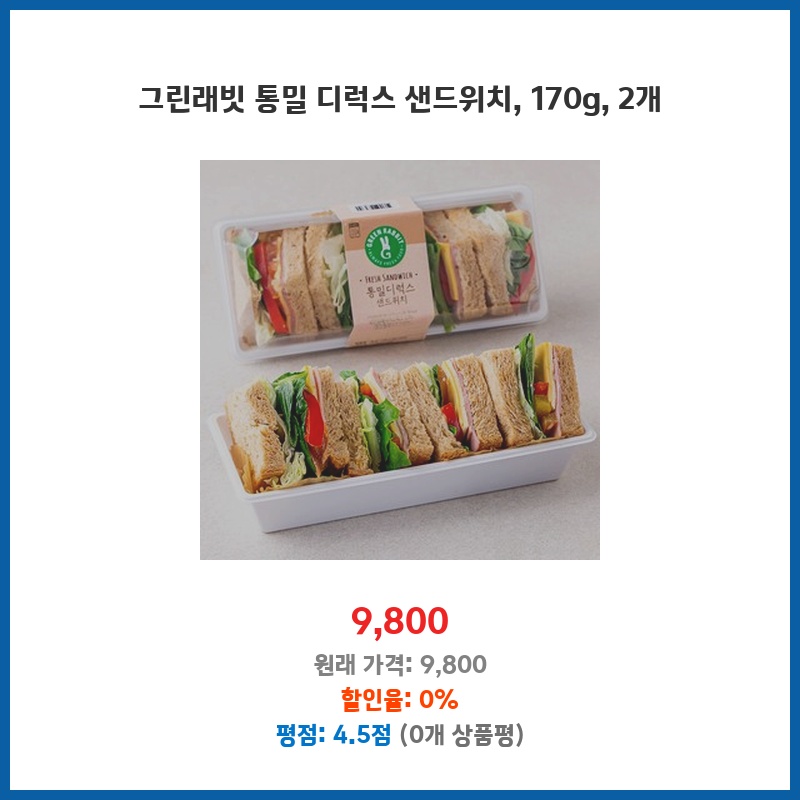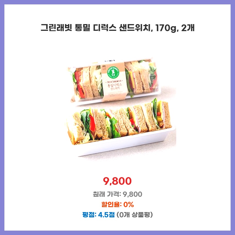 통밀빵의 고소함과 신선한 채소가 듬뿍 들어간 샌드위치가 먹고 싶어서 구매했습니다. 2개입이라 간편하게 나눠 먹을 수 있는 점도 좋았습니다. 170g의 넉넉한 양도 마음에 들었습니다.