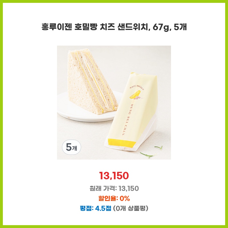 간편하게 즐길 수 있는 아침 식사 대용으로 홍루이젠 샌드위치를 선택했습니다. 호밀빵의 고소함과 치즈의 조화가 궁금했고, 5개입이라 가성비도 좋아 보였습니다. 개별 포장되어 휴대성도 좋을 것 같아 구매했습니다.