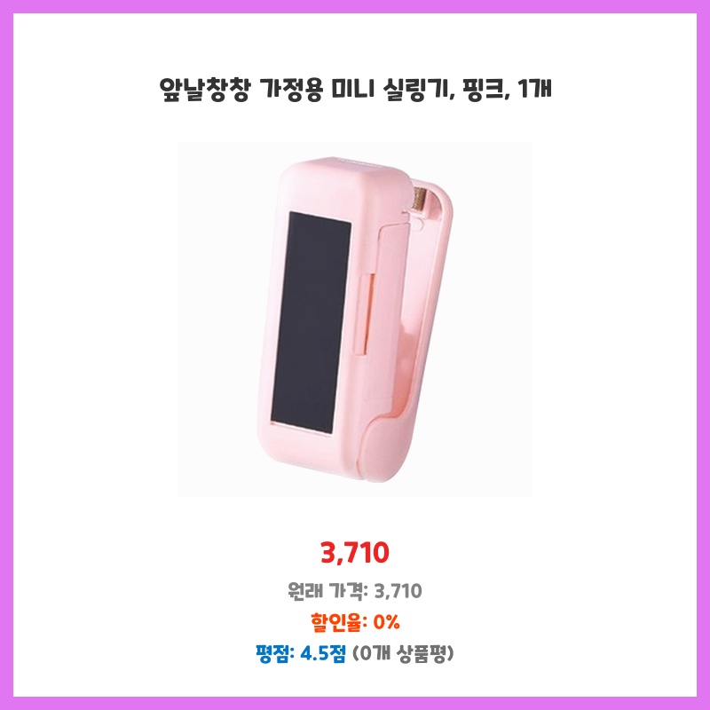 생각보다 작지만 성능은 좋네요! 간단한 간식 포장에 딱이고, 휴대성도 좋아서 만족합니다. 핑크색도 너무 예뻐요.