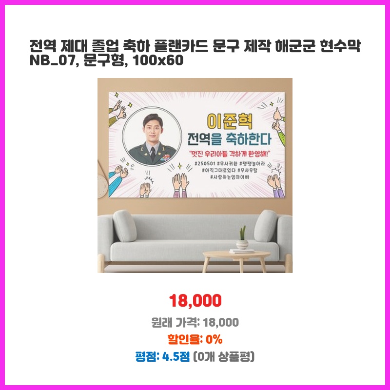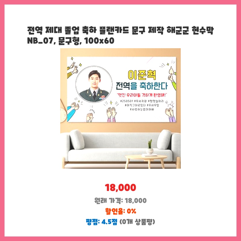 전역과 졸업을 동시에 축하하는 특별한 현수막이 필요했습니다. 100x60cm 사이즈에 원하는 문구 제작이 가능하고, 해군 군복 디자인이 포함되어 있어 기념하기에 딱 맞는 상품이라고 생각했습니다. 깔끔한 문구형 디자인도 마음에 들었습니다.