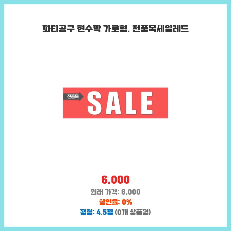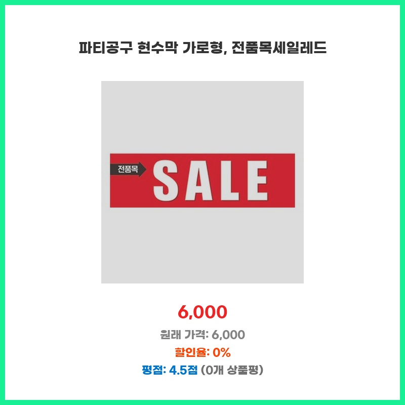 파티 분위기를 확실하게 내고 싶어서 가로형 현수막을 찾았는데, 전품목 세일 문구가 크게 적혀 있어서 시선을 사로잡았습니다. 깔끔한 디자인에 가격도 저렴해서 바로 구매했습니다. 행사 분위기 연출에 효과적일 것 같아 기대됩니다.
