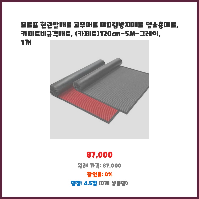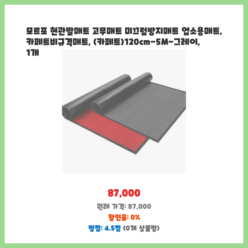 업소용으로 넓고 튼튼한 현관매트가 필요했습니다. 120cm의 폭과 5m의 길이로 넉넉한 크기고, 고무 소재라 오염이나 마모에 강할 것 같아 구매했습니다. 미끄럼 방지 기능도 중요한 선택 기준이었습니다.
