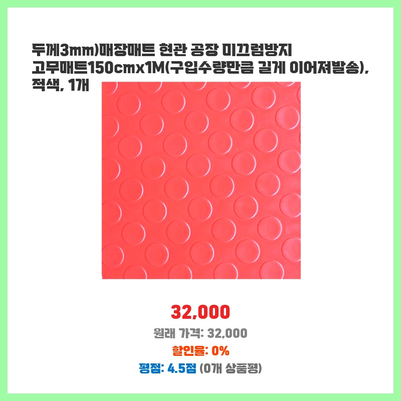 현관 입구에 놓을 미끄럼 방지 매트가 필요했습니다. 3mm 두께라 적당히 쿠션감이 있고, 150cm x 1m 사이즈라 현관문 앞을 충분히 커버할 것 같아 구매했습니다. 적색이라 시각적으로도 포인트가 되네요.