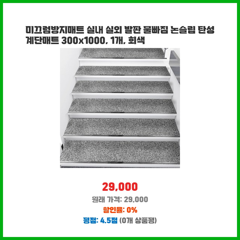 계단이 미끄러워 위험했는데, 넉넉한 크기(300x1000mm)의 미끄럼방지 매트를 찾던 중이었습니다. 물빠짐 기능도 있어 습기 걱정 없고, 탄성이 있어 쿠션감도 좋을 것 같아 구매했습니다. 회색이라 어떤 인테리어에도 잘 어울릴 것 같았습니다.