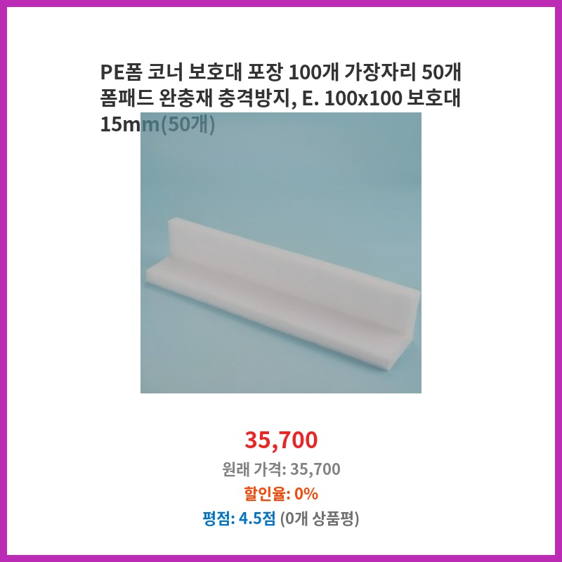 포장 중 파손 방지를 위해 PE폼 코너 보호대가 필요했습니다. 100개에 50개의 폼패드까지 포함된 구성이 가격 대비 효율적이어서 구매했습니다. 15mm 두께로 충격 흡수에도 도움이 될 것 같아 선택했습니다.
