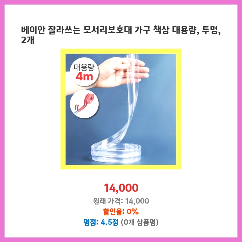 책상 모서리가 날카로워 아이가 다칠까 걱정되어 구매했습니다. 투명 소재라 디자인을 해치지 않고, 대용량이라 여러 곳에 부착 가능해서 좋습니다. 2개 세트라 더욱 경제적이었습니다.